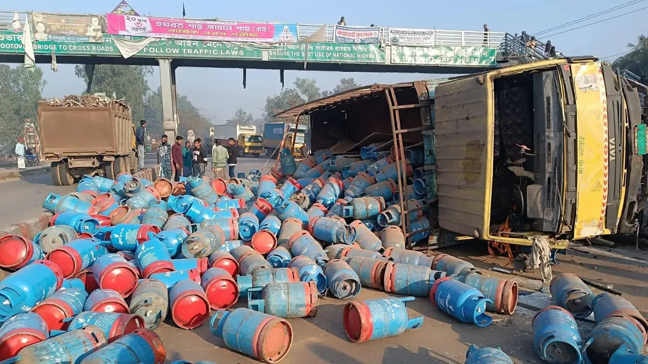মহাসড়কে শতাধিক গ্যাস সিলিন্ডার, বিভাজকে থেঁতলানো লাশ