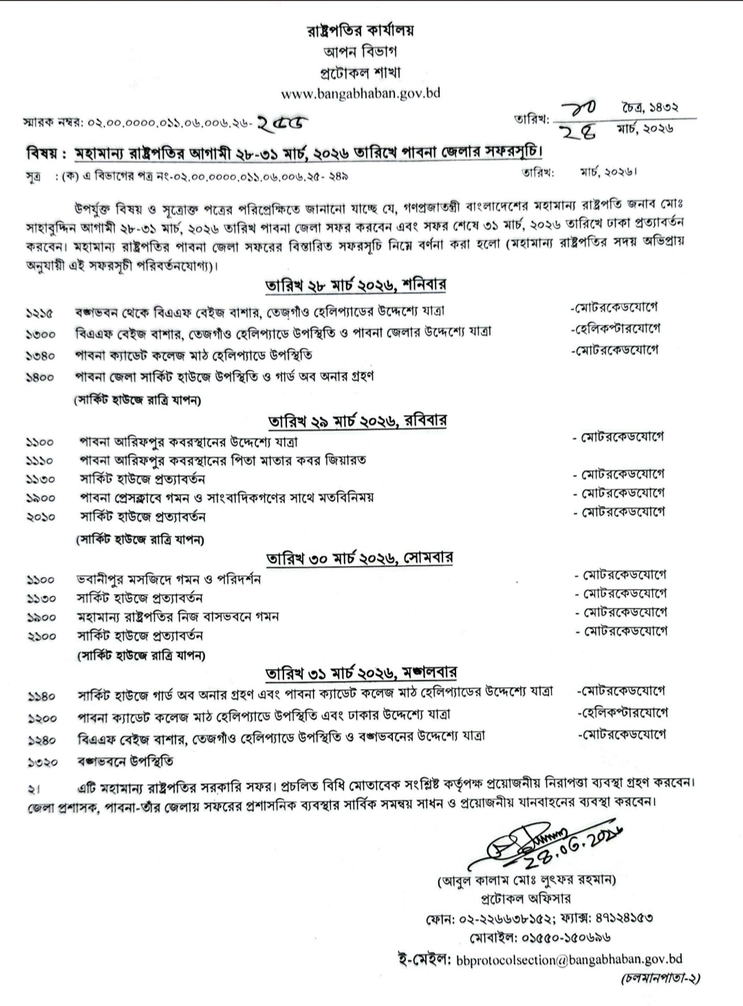 প্রটোকল অফিসারের দেয়া তথ্যানুযায়ী, রাষ্ট্রপতি ২৮ মার্চ শনিবার দুপুর ১টায় ঢাকার বঙ্গভবন থেকে হেলিকপ্টারযোগে পাবনার উদ্দেশ্যে রওনা হবেন। ১টা ৪০ মিনিটে পাবনা ক্যাডেট কলেজ মাঠে হেলিপ্যাডে অবতরণ করবেন। এরপর ২টায় পাবনা সার্কিট হাউজে উপস্থিত হয়ে গার্ড অব অনার গ্রহণ করবেন এবং সেখানেই রাত্রি যাপন করবেন।