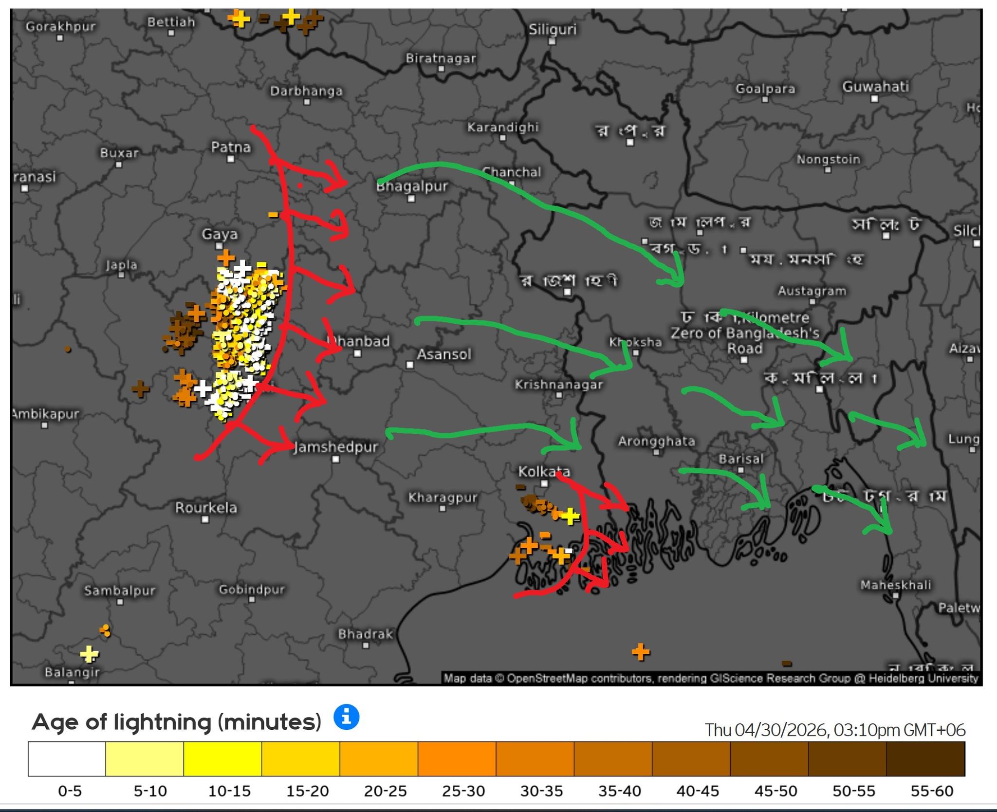 কানাডার সাসকাচুয়ান বিশ্ববিদ্যালয়ের আবহাওয়া ও জলবায়ু গবেষক মোস্তফা কামাল পলাশ নিজের ভেরিফায়েড ফেসবুক পোস্টে জানান, ভারতের ঝাড়খণ্ডে বৃহস্পতিবার বিকেল ৩টার দিকে কালবৈশাখী ঝড়ের সৃষ্টি হয়। সেটি সন্ধ্যার পর বাংলাদেশে প্রবেশ করতে পারে বলে ধারণা করা হচ্ছে।