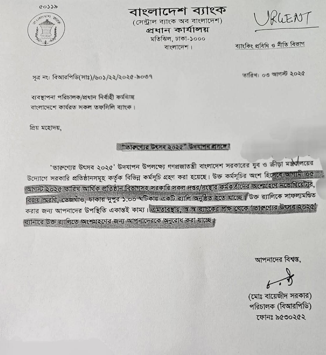 চিঠিতে বলা হয়েছে, যুব ও ক্রীড়া মন্ত্রণালয়ের উদ্যোগে 'তারুণ্যের উৎসব ২০২৫' উদ্যাপন উপলক্ষে আগামী ৫ আগস্ট দুপুর ১টায় রাজধানীর তেজগাঁও এলাকায় নভোথিয়েটার-বিজয় সরণি সড়কে একটি শোভাযাত্রা অনুষ্ঠিত হবে। এই আয়োজনে বিভিন্ন সরকারি প্রতিষ্ঠান ও দপ্তরের অংশগ্রহণ থাকবে, যেখানে ব্যাংকগুলোর উপস্থিতিও বিশেষভাবে প্রত্যাশিত বলে চিঠিতে উল্লেখ করা হয়েছে।