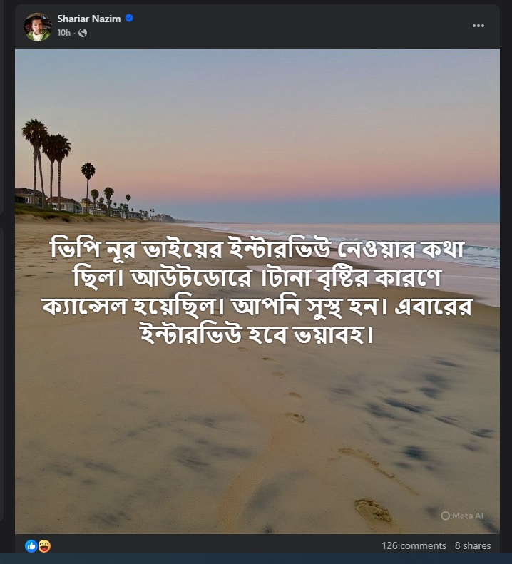 তবে এই সময়ে করে আলোচনার জন্ম দিয়েছেন অভিনেতা-উপস্থাপক শাহরিয়ার নাজিম জয়। শনিবার ভোরে তিনি এক স্ট্যাটাসে জানিয়েছেন, গণঅধিকার পরিষদের সভাপতির সাক্ষাৎকার নেওয়ার পরিকল্পনা ছিল, কিন্তু টানা বৃষ্টির কারণে তা বাতিল করতে হয়েছে। তিনি লিখেছেন, আপনি সুস্থ হয়ে ওঠেন। এবারের ইন্টারভিউ হবে ভয়াবহ।