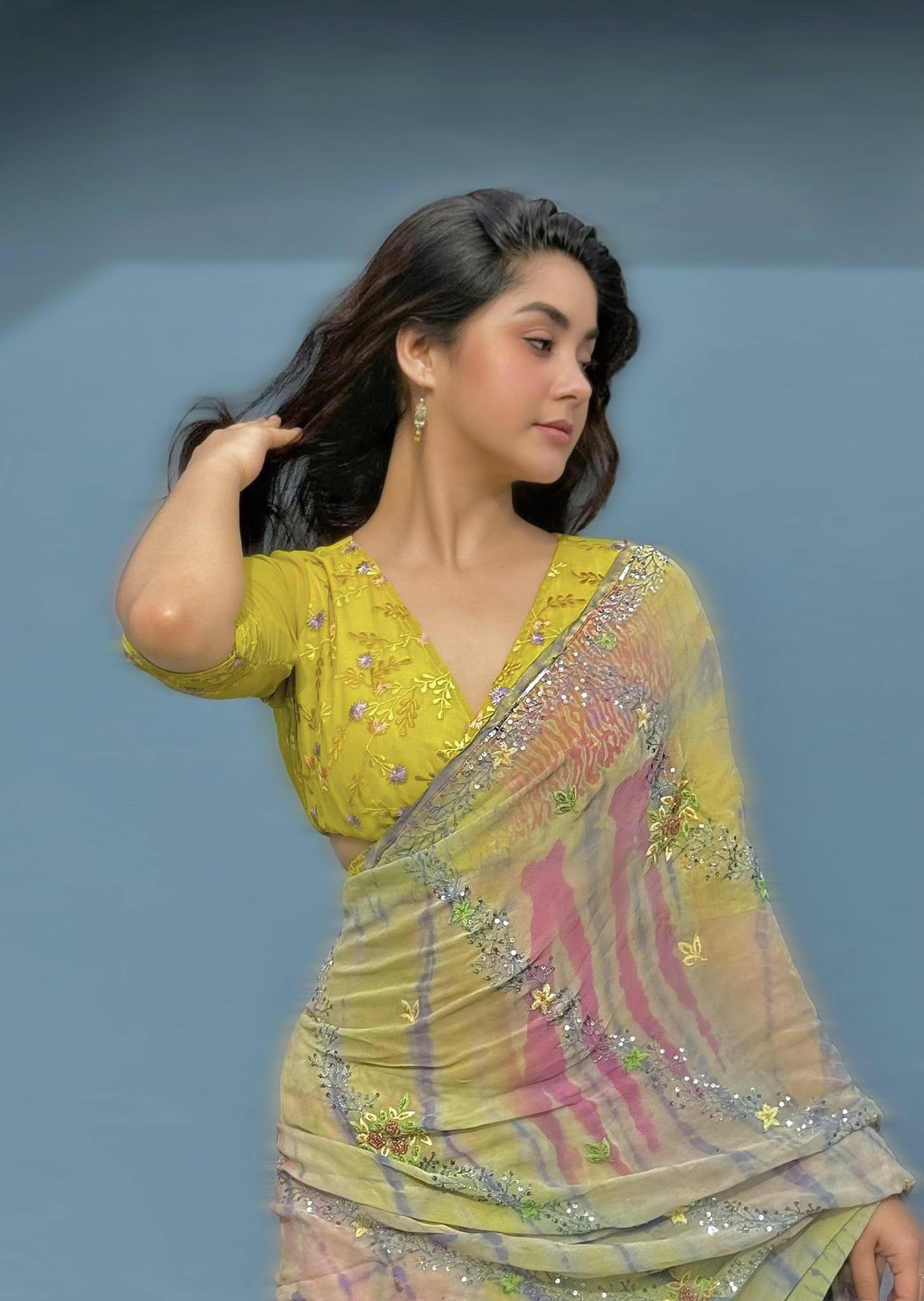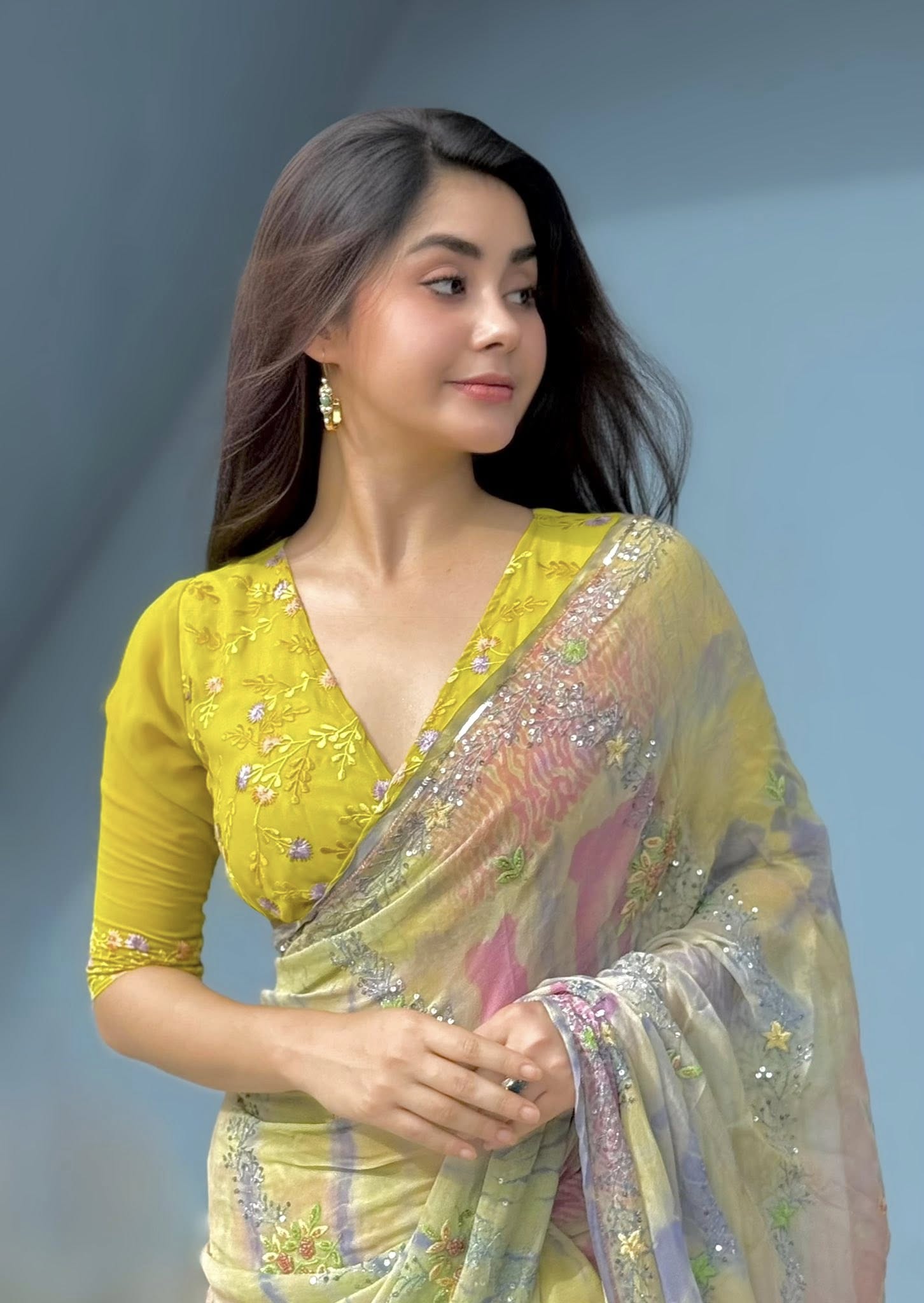 এর সঙ্গে মিলিয়ে পরেছেন একটি উজ্জ্বল হলুদ রঙের ভি-নেক ব্লাউজ। সাজে রেখেছেন স্নিগ্ধতার ছোঁয়া; স্মোকি চোখ আর ন্যুড লিপস্টিকে হয়ে ওঠেন আকর্ষণীয়। সঙ্গে খোলা চুলে তার সৌন্দর্য যেন আরও বেড়ে যায় বহুগুণ।