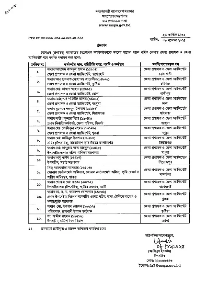 শনিবার (৮ নভেম্বর) গভীর রাতে জনপ্রশাসন মন্ত্রণালয় থেকে এ সংক্রান্ত প্রজ্ঞাপন জারি করা হয়।