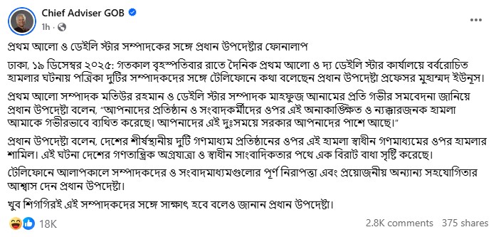 প্রথম আলো সম্পাদক মতিউর রহমান ও ডেইলি স্টার সম্পাদক মাহফুজ আনামের প্রতি গভীর সমবেদনা জানিয়ে প্রধান উপদেষ্টা বলেন, “আপনাদের প্রতিষ্ঠান ও সংবাদকর্মীদের ওপর এই অনাকাঙ্ক্ষিত ও ন্যক্কারজনক হামলা আমাকে গভীরভাবে ব্যথিত করেছে। আপনাদের এই দুঃসময়ে সরকার আপনাদের পাশে আছে।”