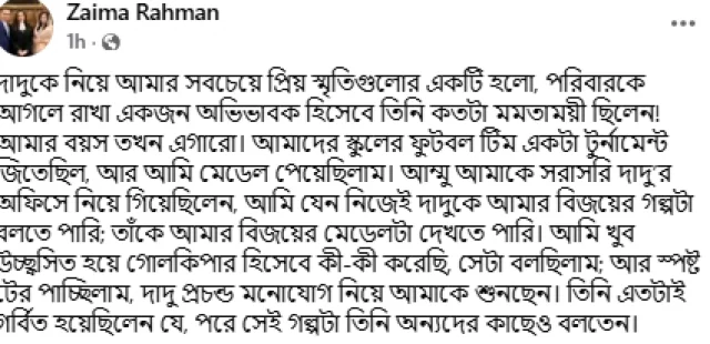 জাইমা লিখেছেন, “দাদুকে নিয়ে আমার সবচেয়ে প্রিয় স্মৃতিগুলোর একটি হলো, পরিবারকে আগলে রাখা একজন অভিভাবক হিসেবে তিনি কতটা মমতাময়ী ছিলেন। আমার বয়স তখন এগারো। স্কুলের ফুটবল টিম জেতার পর আমি মেডেল পেয়েছিলাম। আম্মু আমাকে সরাসরি দাদুর অফিসে নিয়ে গিয়েছিলেন যাতে আমি নিজেই বিজয়ের গল্প বলতে পারি, আমার মেডেল দেখাতে পারি। দাদু মনোযোগ দিয়ে শুনছিলেন এবং এতটাই গর্বিত হয়েছিলেন যে পরে সেই গল্প অন্যদেরও বলতেন।”