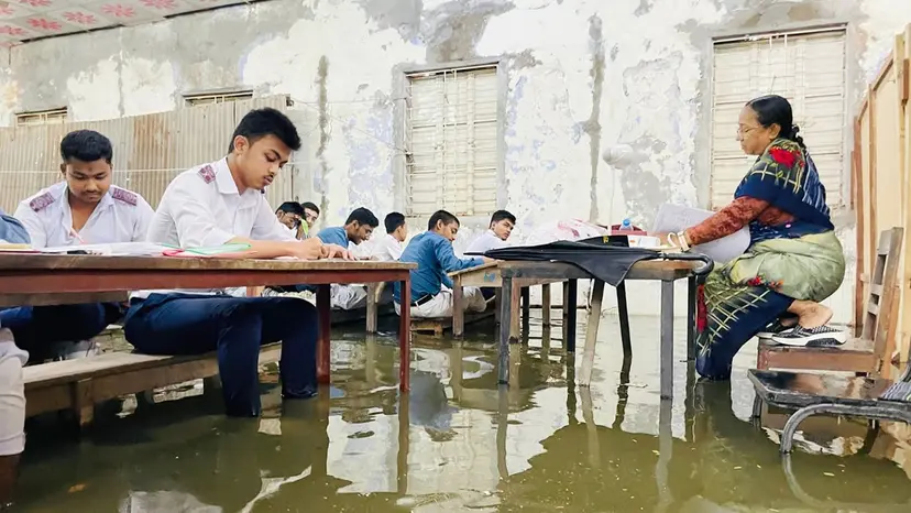জলাবদ্ধতায় বেঞ্চে পা তুলে বসে পরীক্ষা দিল এসএসসি শিক্ষার্থীরা