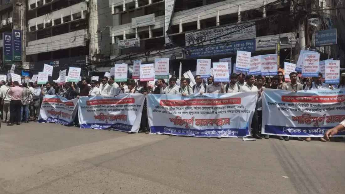 চাকরি ফেরতের দাবিতে ৬ ব্যাংকের কর্মীদের মানববন্ধন