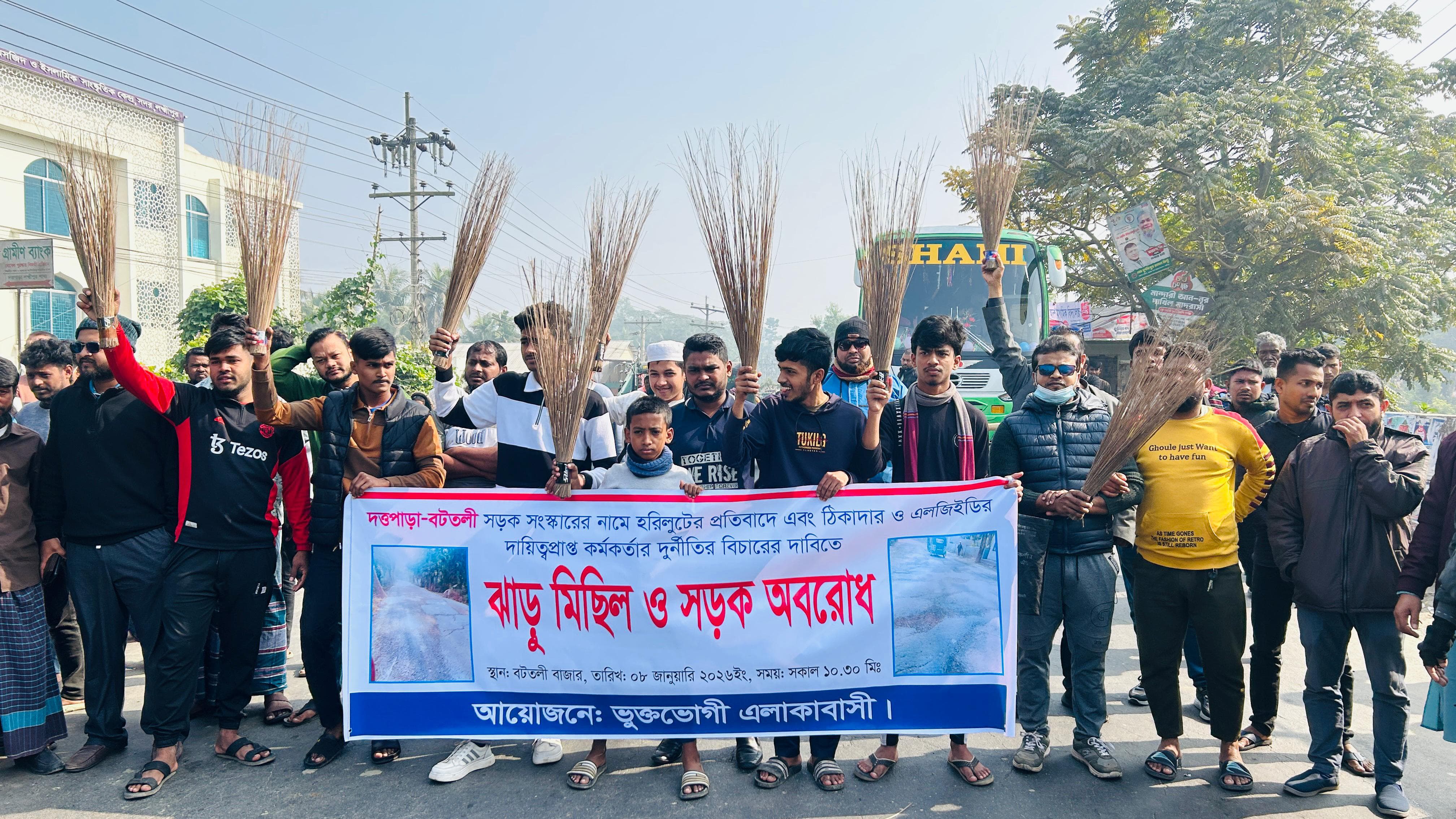 সড়ক সংস্কারের নামে হরিলুট: প্রতিবাদে ঝাড়ুমিছিল ও সড়ক অবরোধ